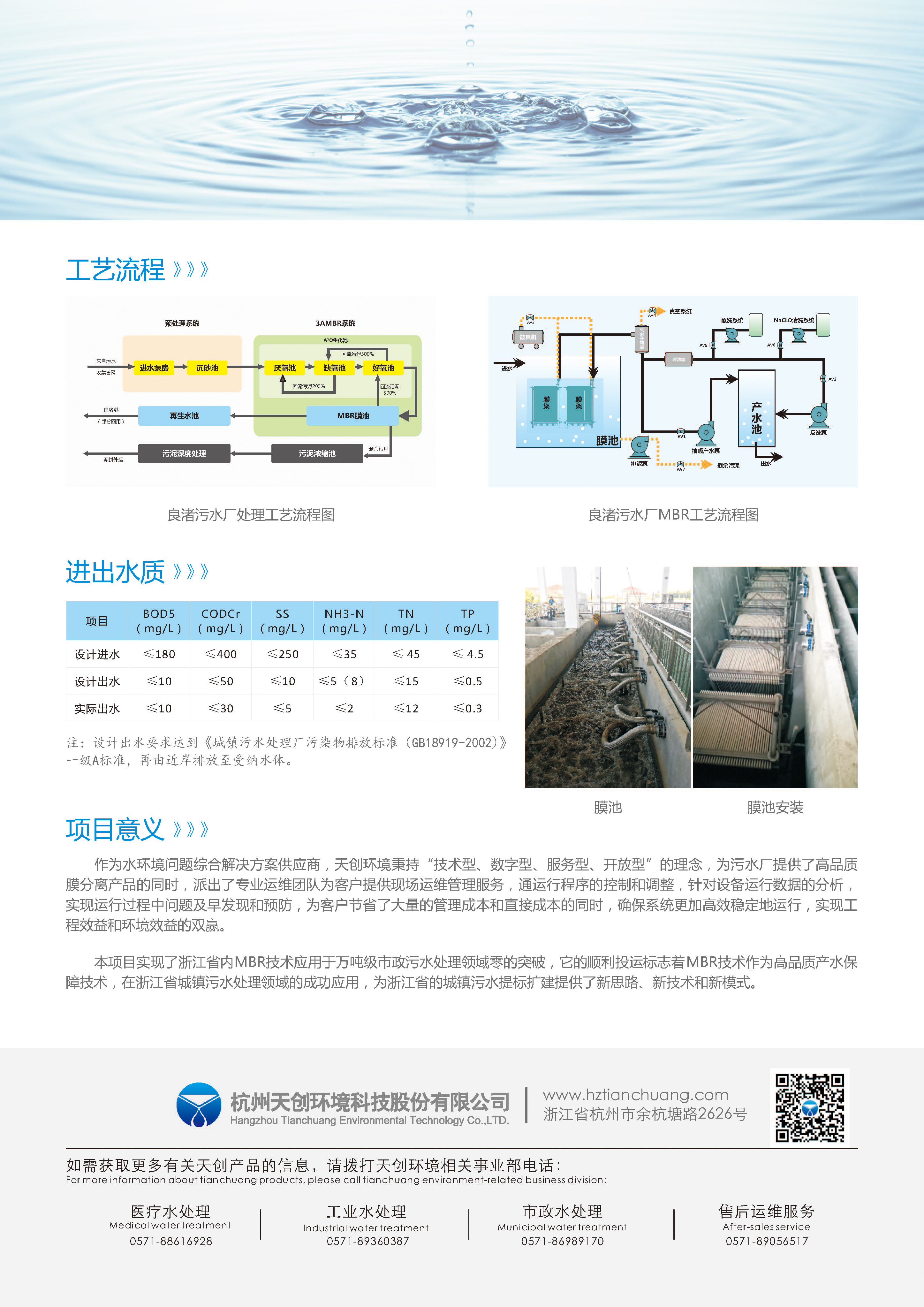 自2013年浙江省提出“五水共治“的環(huán)保思路和策路以來,對水環(huán)境綜合治理的要求日益提高。在此背景下,杭州余杭水務有限公司通過多輪方案對比,選用出水水質(zhì)好、水質(zhì)穩(wěn)定、占地面積較少的MBR技術作為良渚污水處理廠三期工程的處理工藝良者污水處理廠三期工程擴建規(guī)模為處理污水3.0萬噸/日,建成后污水處理總規(guī)模達到7.0萬噸/日