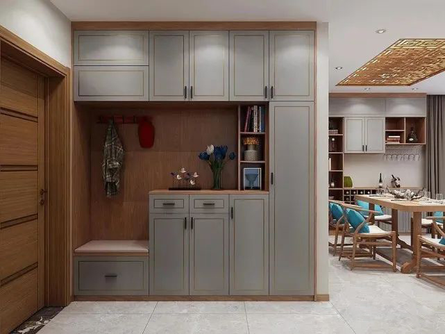 玄關(guān)處大多是全鋁鞋柜和吊柜的一體式,下面是全鋁鞋柜、上面是全鋁吊柜、中間還能留出掛衣服的空間,這樣的設(shè)計(jì)比單純的全鋁鞋柜更人性化。
