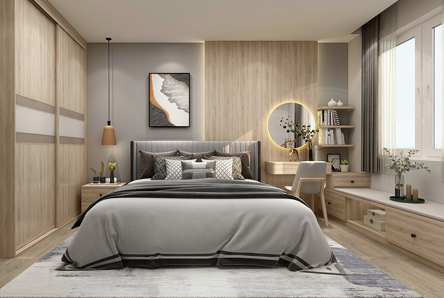 全鋁衣柜與梳妝臺(tái)的一體設(shè)計(jì),不僅能有效利用空間,還能讓空間更具整體性,同時(shí),也是整個(gè)臥室的亮點(diǎn)所在。