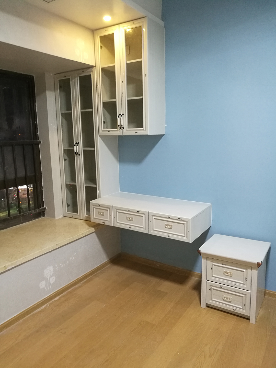 飄窗下方做小矮柜,也叫飄窗柜,柜子儲(chǔ)物,上方鋪軟墊抱枕方便休憩,一舉兩得。