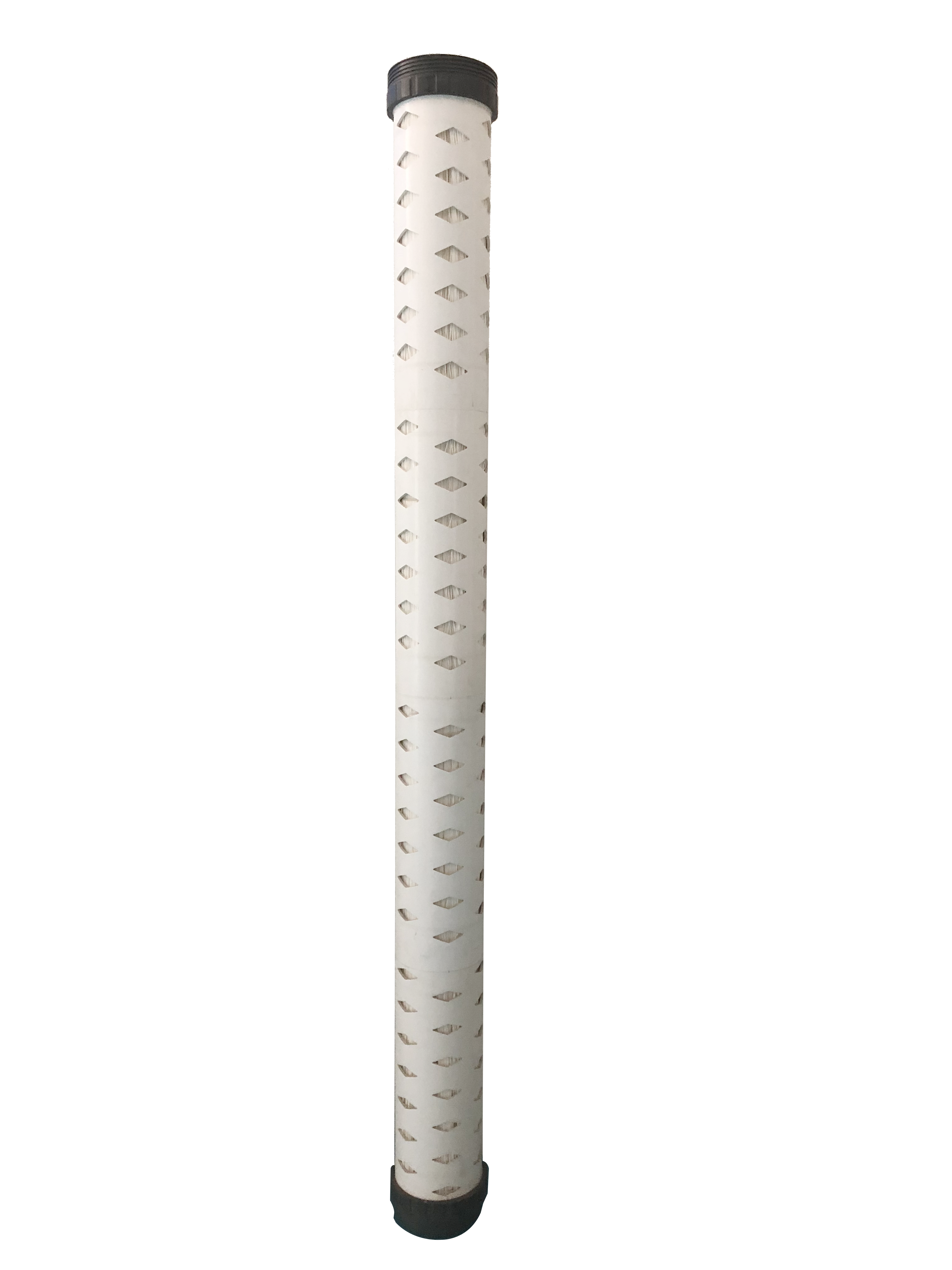 菱形鏤空結構,橫寬縱窄,同開放面積下,徑向膜絲斷絲風險低;且尺寸由底座端至上端蓋處呈漸進式放大設計,曝氣逸散更加均勻,下部菱形孔小,便于底部曝氣集中,上端菱形孔大,便于污染物排出膜外;